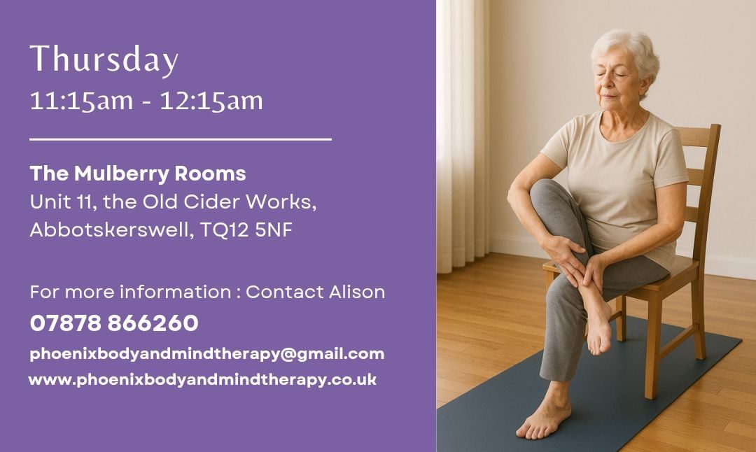Chair Yoga with Alison in Abbotskerswell Looking for a gentle, supportive way to build strength, improve mobility, and find calm? Chair yoga is designed for anyone who would like the benefits of yoga without getting down on the floor. It’s perfect for beginners, older adults, or anyone recovering from injury—or simply for those who prefer [...]